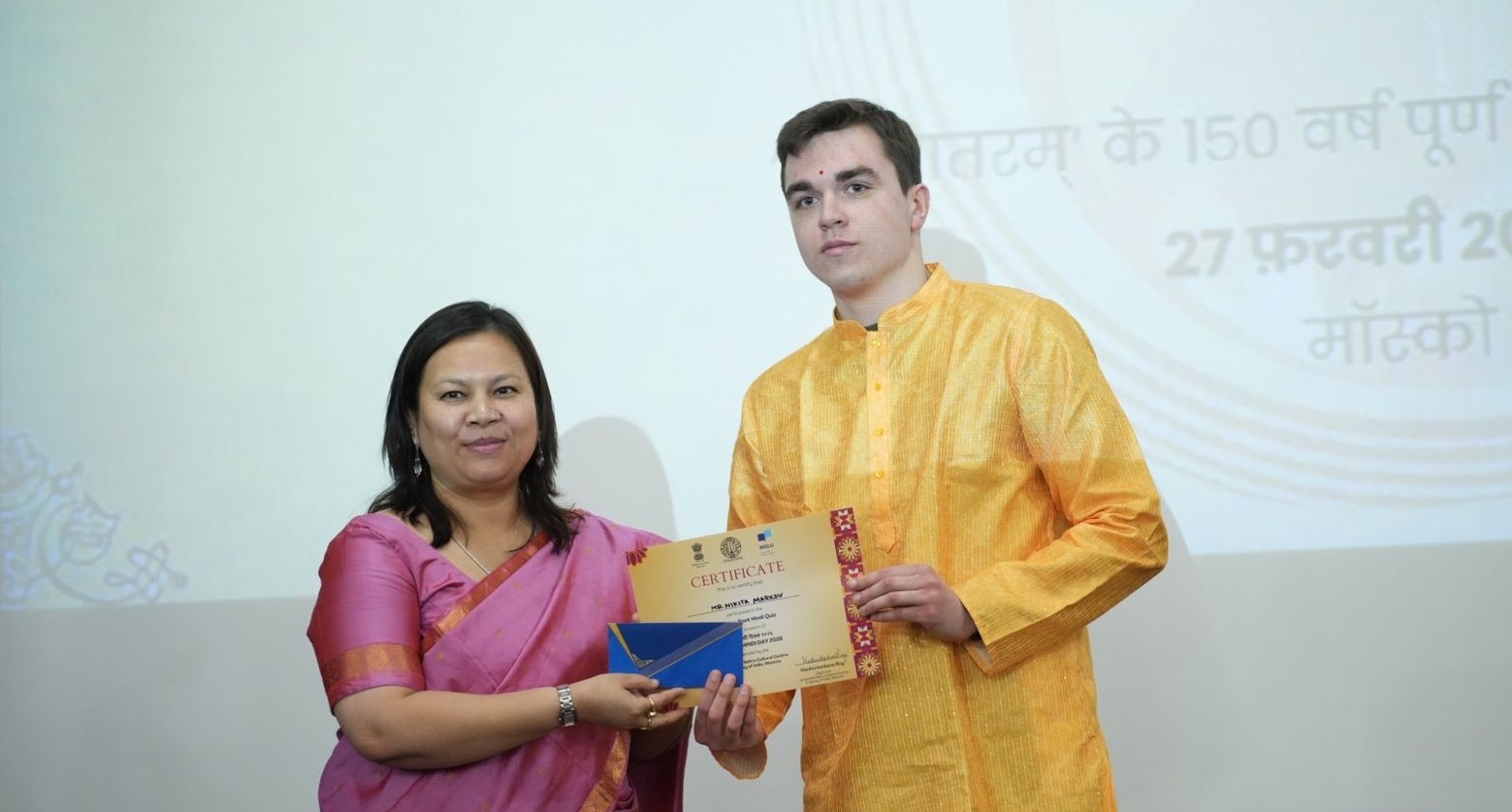 A highlight of the programme was the award ceremony for the winners and participants of the All-Russia Hindi creative video competition “150 Years of Vande Mataram”. Additionally, an engaging on-the-spot Hindi quiz was conducted by Dr. Maksim Demchenko, Associate Professor MSLU.